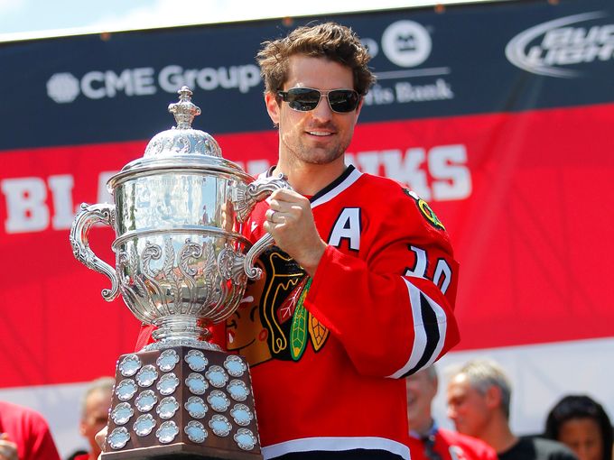 "It's tough to follow that speech by Corey Crawford," Toews said after he carried the Cup onto the stage.